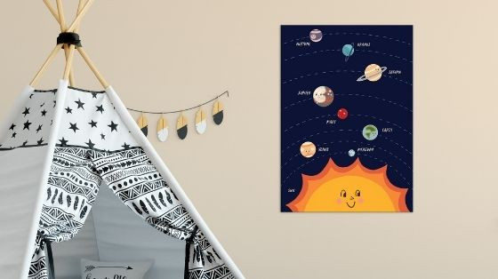 This beautiful free nursery printable is not only eye-catching but also educational. Most kids are fascinated by the solar system, and you are never too young to start learning. The images are super fun and make it easy to remember the names of the different planets.